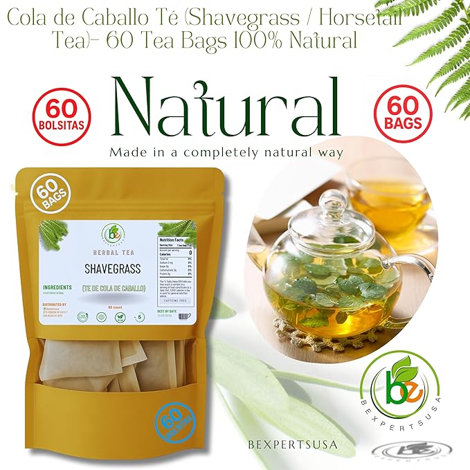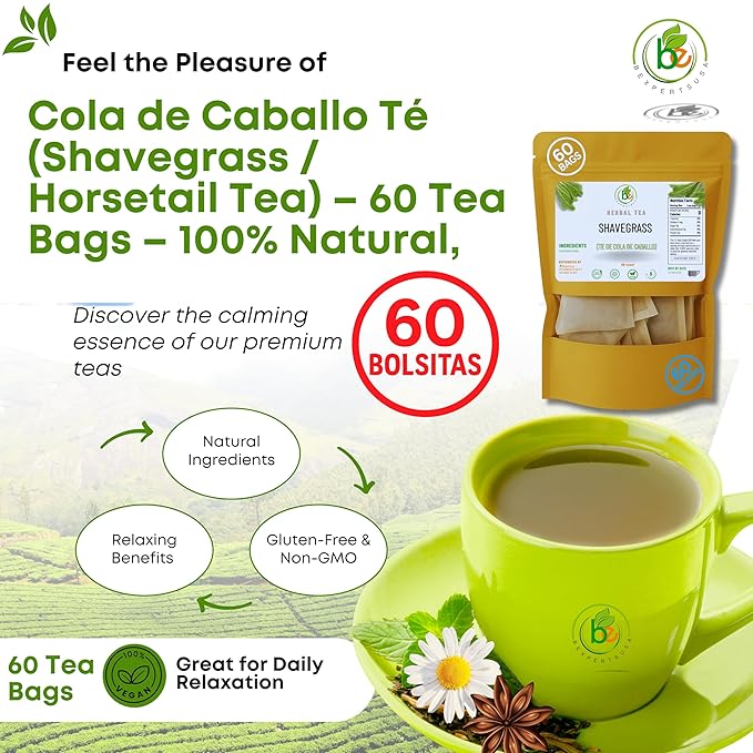 Horsetail Tea (Cola de Caballo) by BexpertsUSA offers a naturally caffeine-free herbal infusion made from 100% pure shavegrass leaves. Revered in traditional herbal practices, this earthy and soothing tea is ideal for your daily wellness routine. Each box contains 60 individually wrapped tea bags, ensuring freshness and convenience. Free from caffeine, gluten, GMOs, and artificial ingredients—just clean, plant-based wellness in every cup. These statements have not been evaluated by the FDA. This product is not intended to diagnose, treat, cure, or prevent any disease. El Té de Cola de Caballo de BexpertsUSA es una infusión herbal 100% natural, libre de cafeína, elaborada con hojas puras de shavegrass (cola de caballo), una planta tradicionalmente valorada en la herbolaria natural. Cada caja contiene 60 bolsitas individuales que conservan frescura y sabor. Libre de gluten, OGM y aditivos artificiales. Una infusión suave para disfrutar cada día como parte de tu rutina de bienestar. Estas declaraciones no han sido evaluadas por la FDA. Este producto no está destinado a diagnosticar, tratar, curar ni prevenir ninguna enfermedad. : 🌿 Cola de Caballo Té (Horsetail / Shavegrass Tea) – 60 Tea Bags 100% Natural | Vegan | Herbal | Gluten-Free | Non-GMO – by BexpertsUSA Traditional Herbal Infusion | Naturally Caffeine-Free Discover the time-honored benefits of Cola de Caballo (Horsetail / Shavegrass) with this pure, plant-based infusion by BexpertsUSA. Known for its earthy, mineral-rich profile, this 100% natural herbal tea has been traditionally used in natural wellness routines for centuries. With no caffeine, gluten, or additives, it’s a clean and calming choice for daily sipping. 🌿 Key Features | Características Principales 🍵 60 Tea Bags – Perfect for everyday use 🌱 Made with 100% Horsetail (Cola de Caballo) – Naturally dried, no fillers 🚫 Caffeine-Free & Gluten-Free – Gentle on your system, day or night 🌾 Non-GMO & Vegan – Clean, conscious ingredients 🇲🇽 Inspired by Traditional Herbal Practices – Trusted in Latin American remedies ✨ Benefits with Flair – Naturally Balanced Support ✨ 🌿 Traditional Plant Power Horsetail has been used for generations as a mineral-rich, plant-based infusion. 💧 Mild & Earthy Flavor A clean-tasting tea that pairs well with lemon, mint, or ginger. 🧘 Caffeine-Free Calm Perfect for relaxation, hydration, and herbal wellness rituals. ♻️ Eco-Friendly Herbal Choice No artificial colors, preservatives, or additives—just pure nature. 📦 Generous 60-Count Pack Ideal for daily use or sharing with fellow tea lovers. ☕ How to Brew / Cómo Preparar Steep 1 tea bag in 6–8 oz of hot water for 5–7 minutes Optional: Add lemon, cinnamon, or honey Enjoy hot or iced depending on the season or mood 💖 Cola de Caballo Té by BexpertsUSA – A grounded, earthy infusion rooted in tradition and crafted for modern wellness. Té herbal suave y natural – perfecto para tu rutina diaria. 🌿🍵