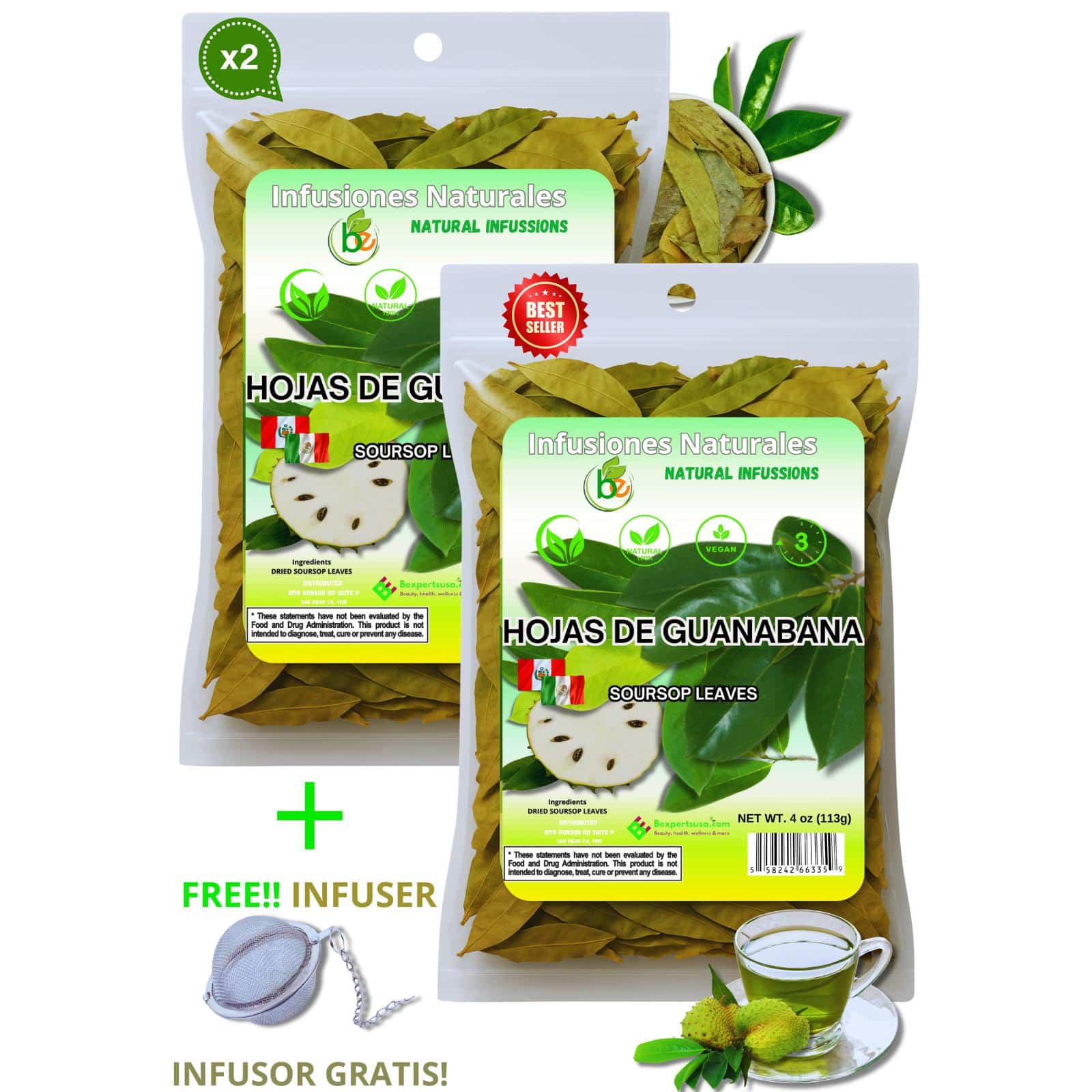 Hojas de Guanábana (Soursop Leaves) – 2 Pack (4 oz Bags) 100% Natural | Vegan | Herbal Tea for Infusion | Includes Infuser/Incluye Infusor, Traditional Latin Herbal Infusion