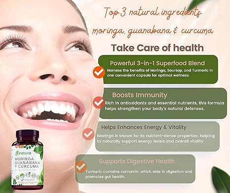 Moringa, Guanabana & Curcuma (Moringa, Soursop, & Turmeric) 90 Capsules 1500 mg per Serving Powerful Blend of 100% Natural Premium Ingredients, Vegetable, cultivada organicamente |organically Grown
