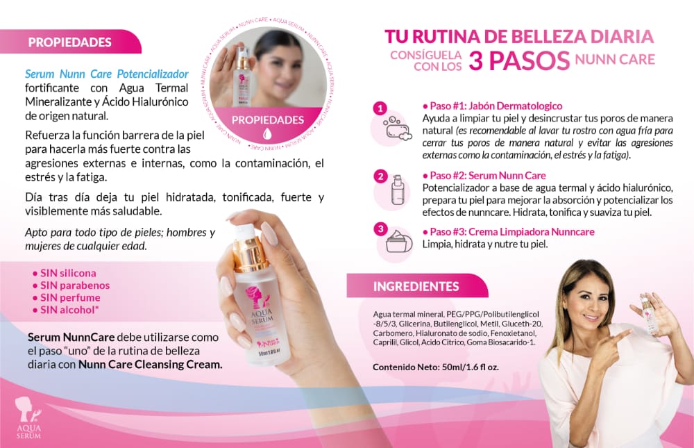 Muchos problemas de la piel son resultados de la derivación de las acumulaciones de impurezas que causan una apariencia indeseada. NUNN CARE ayudará a tu piel a eliminarlas, evitar su acumulación; se ocupará de fortalecer su barrera de protección para hacerla más fuerte contra agresiones externas e internas. NUNN CARE Crema Limpiadora y Aqua Serum se convertirán en #ElDuoPerfecto que permitirá a tu piel lucir reluciente, hidratada y limpia.